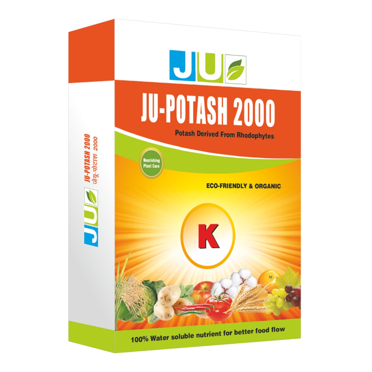 JU Potash‑2000 improves the size, color, and shape of produce, while also enhancing the shelf life of fruits and vegetables. It promotes better root development, stronger stems, and improved nutrient use efficiency. The formulation helps plants cope with environmental stress, lodging, and disease pressure.